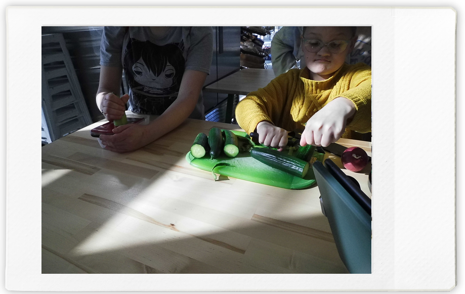 Valerie’s grandparents were farmers in Nebraska. They did not have much money but were “land rich,” and raised pigs, chickens, and sheep. A resourceful and skilled gardener, Valerie’s grandmother grew and pickled vegetables to keep the family well-nourished throughout the winter. This salad mimics the use of pickled cucumbers because some were always in the cellar, even when cucumbers were out of season.